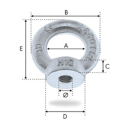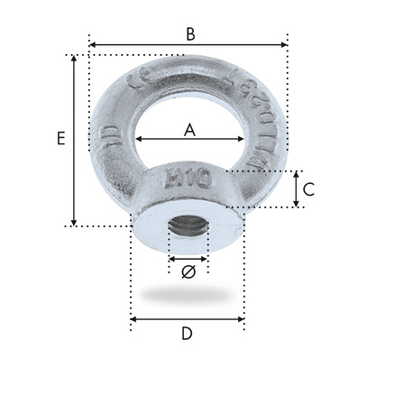 | REF. | Ø (mm) | C.M.U (kg) | A (mm) | B (mm) | C (mm) | D (mm) | E (mm) | Poids / 100p (kg) |
