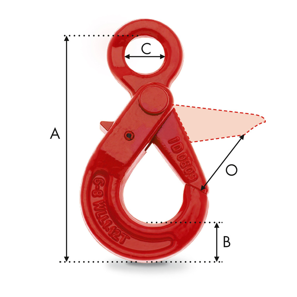 Le crochet à oeil à verrouillage automatique est en acier allié trempé et revenu de couleur rouge, donc extrêmement résistant et adapté pour tout type d'élingue mais surtout utilisé pour les élingues câble.