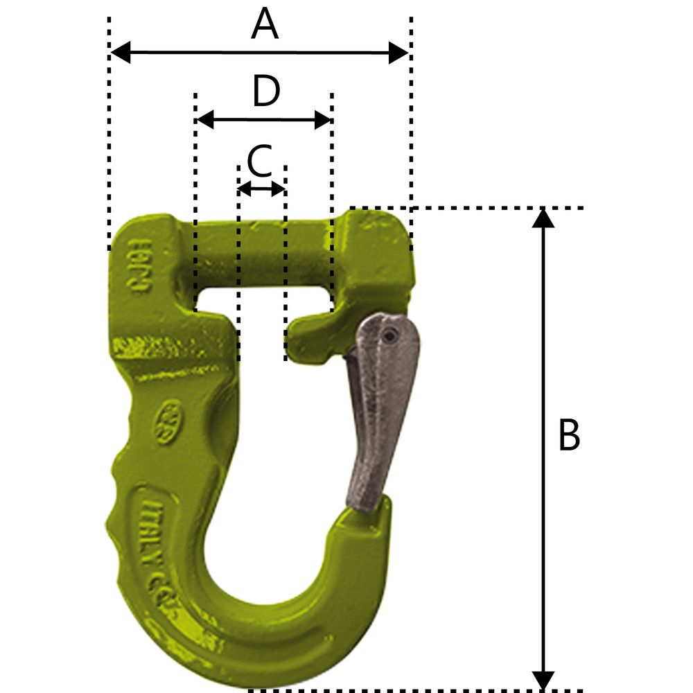 L'ouverture du crochet à linguet (dimensions T1 et T2) et le passage plat du crochet pour élingue textile (dimenions D) sont bien en accord avec la largeur de l'élingue textile (à CMU identiques), qu'elle soit une élingue tubulaire ou élingue à 2 boucles.