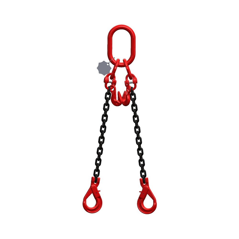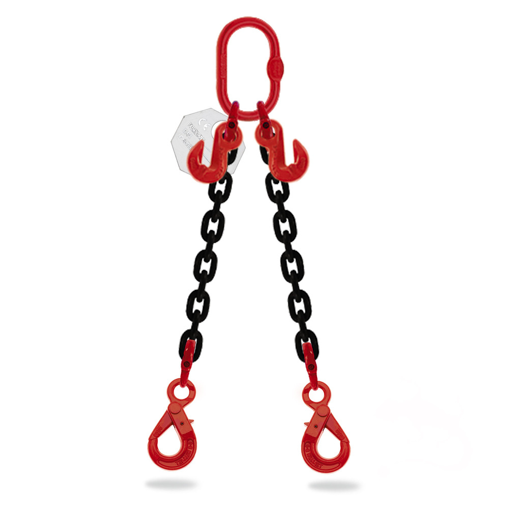 La chaine de levage 2 brins Grade 80 Haute résistance avec crochets automatiques et raccourcisseurs est généralement employée pour manutentionner des charges moyennement encombrantes (C.M.U. jusqu'à 21,200 tonnes) avec les points d'accroches adaptés au centre de gravité de la pièce.