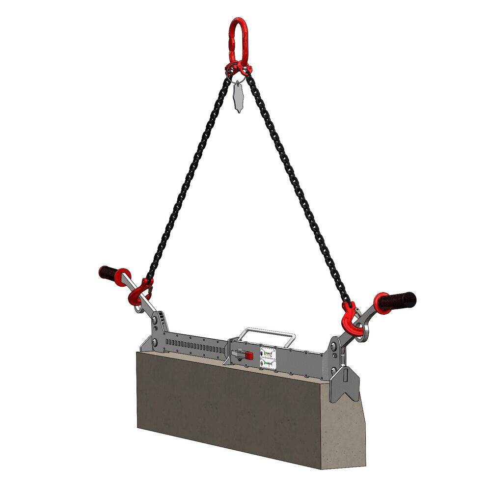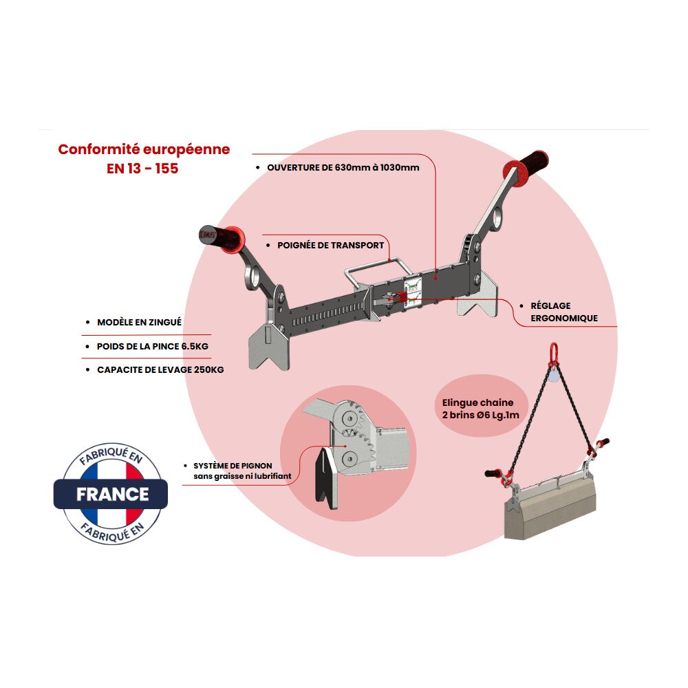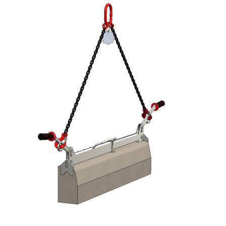 Pour un levage mécanique : fixer les crochets des 2 brins de chaîne aux ouvertures positionnées sur les poignées de la pince puis raccorder la maille de tête de l'élingue à votre appareil de levage (grue, mini pelle...).