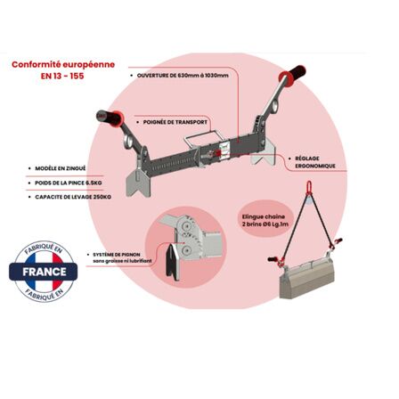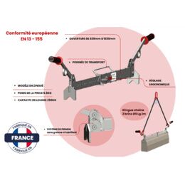 Conçue pour répondre aux exigences des professionnels du BTP, cette pince de levage allie robustesse, sécurité et praticité. Fabriquée en France, elle incarne le savoir-faire industriel au service de vos chantiers les plus exigeants.