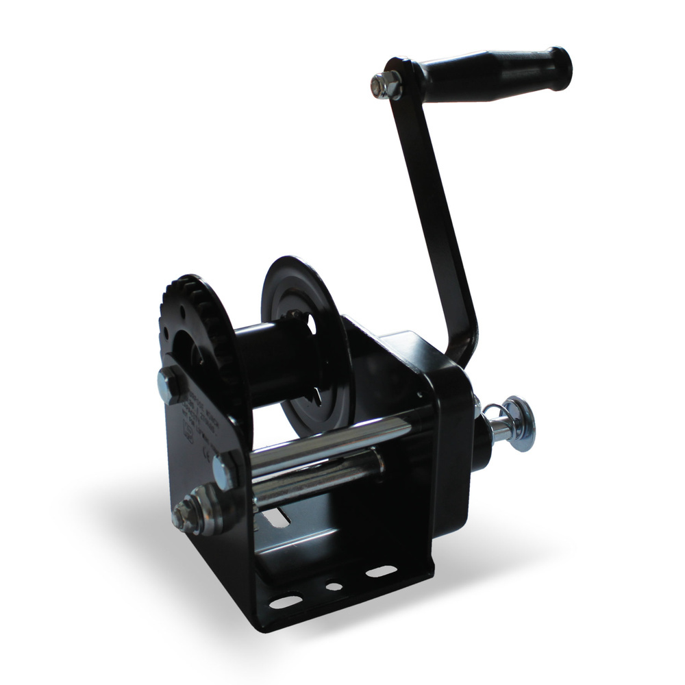 Treuil de halage ou de traction pratique en mobilité sur camions ou remorques, permettant d’enrouler ou dérouler en permanence le câble sur son tambour actionné par une manivelle et avec cliquet anti-retour (ou ‘frein’) qui permet de retenir la charge lors du délestage de celle-ci.